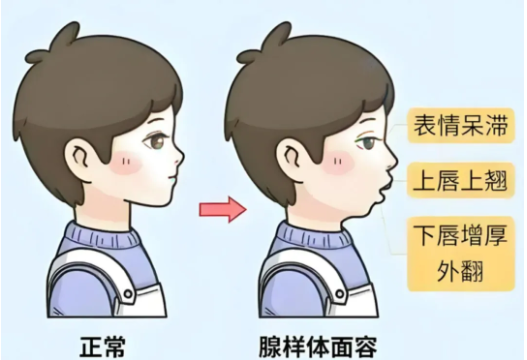 3、面容改变:长期张口呼吸会影响孩子的面部骨骼发育,逐渐形成塌鼻梁、高颧骨、上牙外突、嘴唇上翘、脸部拉长,出现“腺样体面容”。腺样体肥大还可能继发引起中耳炎、鼻窦炎等多种并发症。