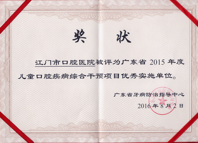 近日,我院被省牙防中心评为广东省2015年度儿童口腔疾病综合干预项目优秀实施单位,获颁奖状以资鼓励。