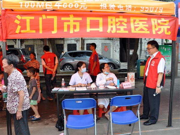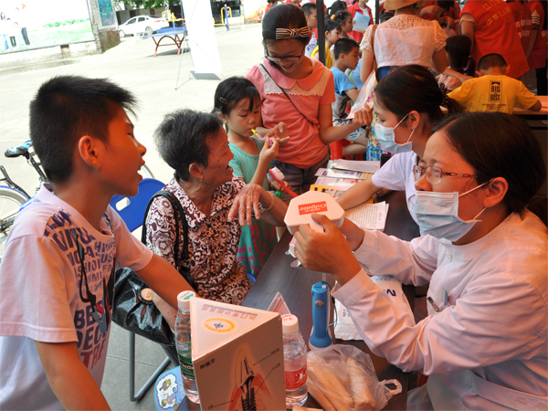张小红医生为小朋友进行口腔健康检查及宣传口腔保健知识。