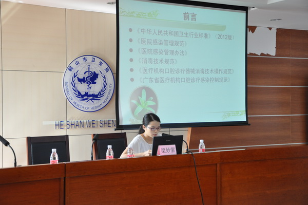 2015年7月14日上午,鹤山市卫生和计划生育局举办了医院感染管理知识培训班,邀请我院供应室梁妙萦护师向鹤山市各民营口腔诊所讲解口腔科院感知识。