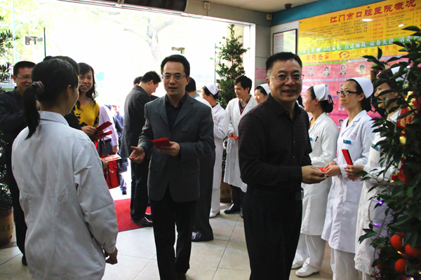 2013年2月19日大年初十上午,春风和煦,阳光明媚。江门市副市长陈佳林在副秘书长区达洪、市卫生局局长宋华、副局长蓝敏雄等领导的陪同下,亲自到我院慰问临床一线医务人员,向医务人员逐一派发新年利是,并送上衷心的问候及节日的祝福,鼓励大家立足岗位、努力服务市民。陈佳林副市长等领导还视察了我院的医疗环境,了解我院的基本情况,对我院的各项工作表示充分肯定。