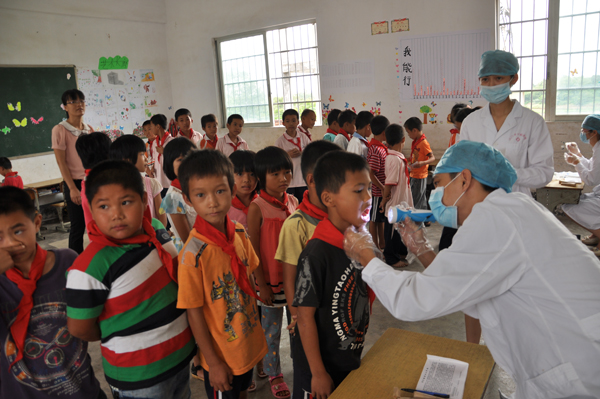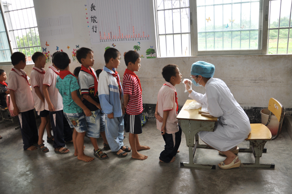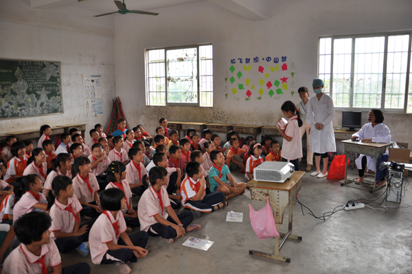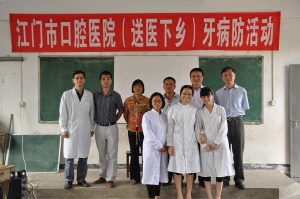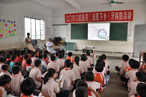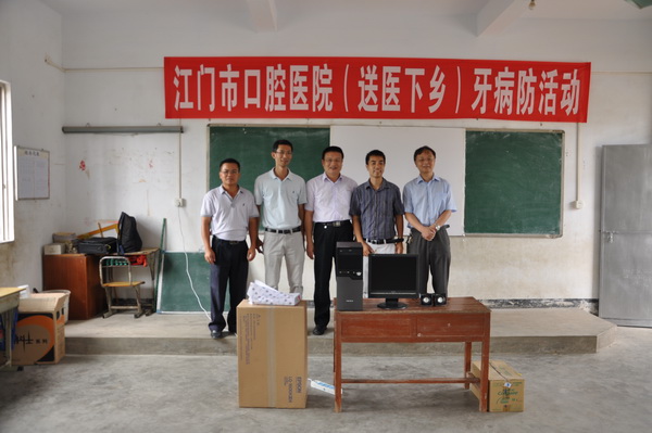 为落实口腔卫生下乡工作,2013年9月26日,我院谢佐理院长、龙文副院长亲自带领医护人员合共7人,到恩平市横陂镇白庙村白庙小学进行医疗扶贫义诊宣传活动,并为白庙小学赠送电脑设备,为提高白庙村的教学力量出一分力。张小红主治医师生动活泼、绘声绘色地向小学生们讲解如何预防和治疗蛀牙,让孩子们学会如何保护牙齿。同时,医护人员还为白庙小学的150多位学生提供免费口腔健康检查、发放口腔保健资料及牙膏等。本次检查中发现学生们对于口腔健康的重视程度不够,患龋率达到99%,猖獗龋发病率较高。通过本次义诊宣传旨在提高白庙村小学生预防口腔疾病和自我保健的意识,促进形成科学健康的生活方式。