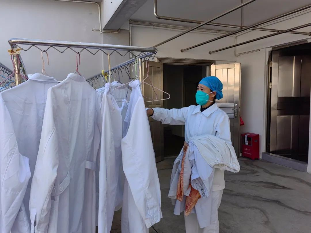 洗衣房人员正在为我院医务人员的衣物做好收拾整理工作。