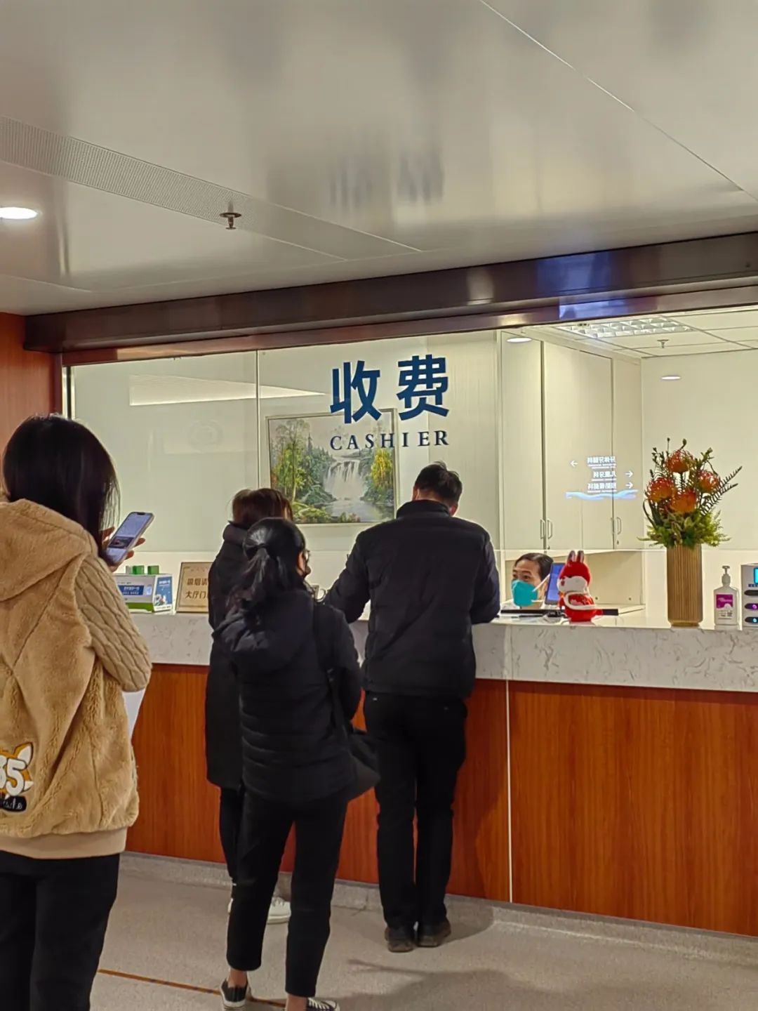 收费窗口前,患者有序排队,收费员正在认真核对收费项目,按规范进行收费。